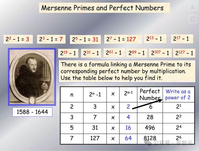 当时,欧几里得想要在他的《几何原本》中描述偶完全数。他意识到偶完全数都与某个素数p形式为2ᴾ-1的素数密切相关(现在称为梅森素数)。