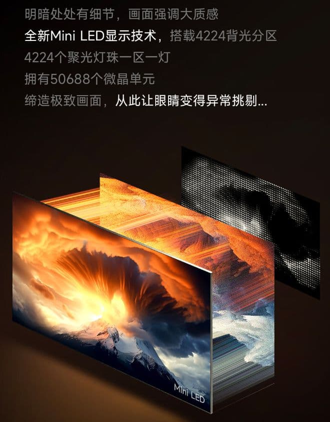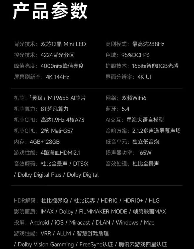 尺寸分区亮度低音炮音响内存价格65 英寸18003300nits1.7L135W4+64GB4599 元75 英寸23403300nits1.7L135W4+64GB6499 元85 英寸29403800nits1.7L165W4+128GB8499 元100 英寸 4224 4000nits 2.5L 165W4+128GB13999 元