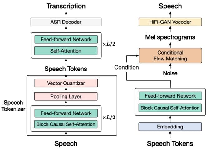 语音合成方面,则采用了Flow Matching模型流式从音频token合成音频,最低只需要10个token合成语音,最大限度降低对话延迟。