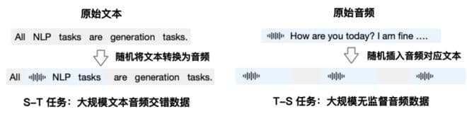 而在预训练方面,为了攻克模型在语音模态下的智商和合成表现力两个难关,智谱将Speech2Speech任务解耦合为Speech2Text(根据用户音频做出文本回复) 和Text2Speech(根据文本回复和用户语音合成回复语音)两个任务,并设计两种预训练目标适配这两种任务形式: