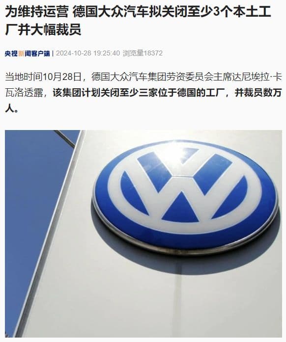 IT之家 10 月 28 日消息,据央视新闻报道,当地时间 10 月 28 日,德国大众汽车集团劳资委员会主席达尼埃拉・卡瓦洛透露,该集团计划关闭至少三家位于德国的工厂,并裁员数万人。