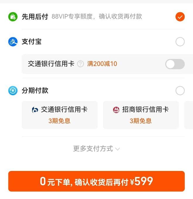 据解释,“先用后付”是平台针对信用记录良好的消费者提供的专享服务。在一定的信用额度内,消费者可先0元下单商品,到期付款之前再选择付款或退货,如果到期没有主动付款,系统也会自动代扣。