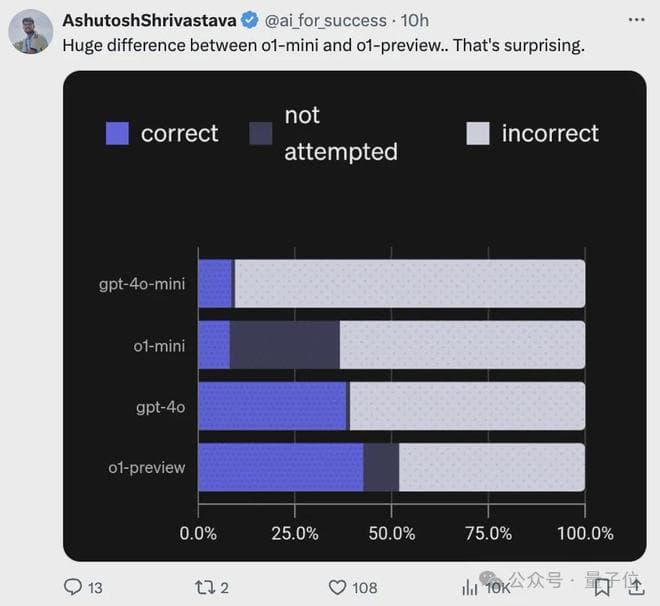 有意思的是,o1-mini和o1-preview在此基准上都不及格,而且两者相差还很大: