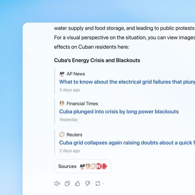 新闻方面,如果搜索古巴能源危机和停电相关的新闻,可以看到美联社、金融时报、路透这类主流新闻媒体的报道标题,并提供来源。