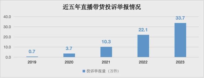 这也导致,直播电商行业的客诉量飞速攀升。据国家市场监管总局披露的数据显示,近五年来,中国直播电商市场规模增长10.5倍,直播带货投诉举报量增幅高达47.1倍。