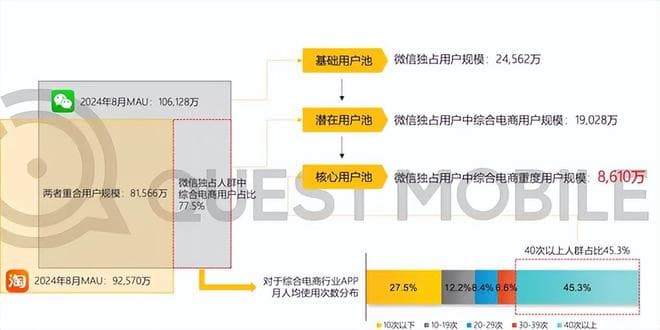 事实上,接入微信支付首月,淘宝就立竿见影享受到了增长红利。QuestMobile数据显示,接入微信支付后,9月单月淘宝和微信重叠用户增长2090万,明年淘宝月活有望首破10亿。