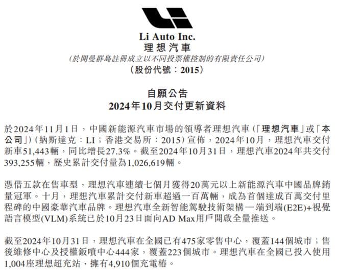 董事长李想表示,公司在十月成为首家均价在30万元以上、累计销量超过百万辆的中国豪华汽车品牌,接下来将继续加大在AI领域的研发投入。
