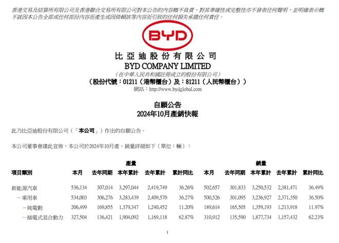 比亚迪:10月新能源车销量502657辆