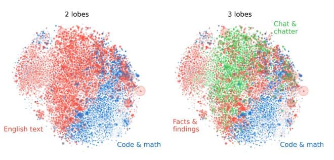 比如,跟数学和编程相关的概念会聚在一起形成一个区域,而处理日常对话的概念会聚在另一个区域。