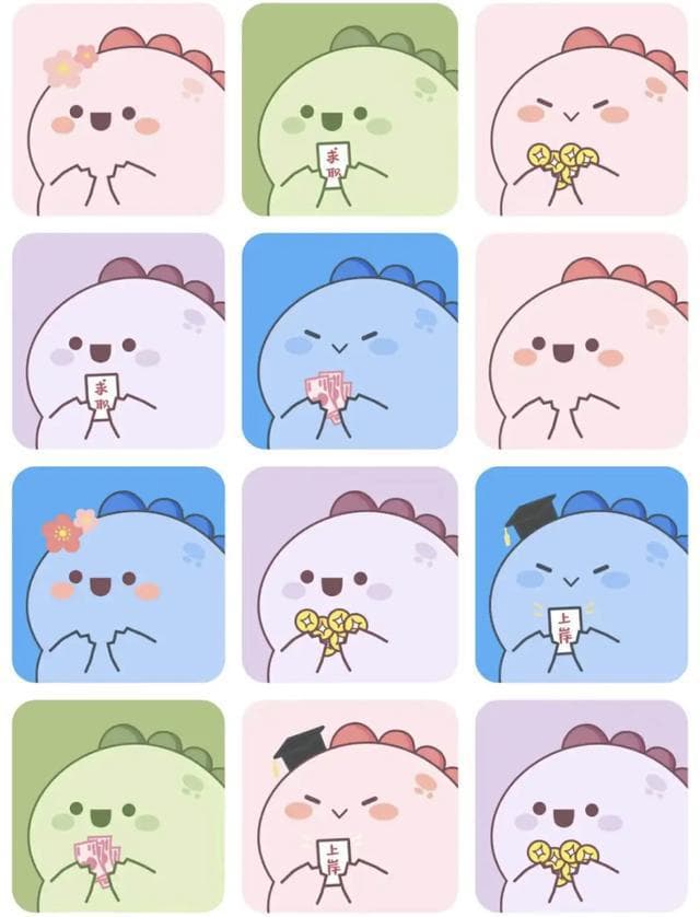 还有人选择给头像换个颜色或加一些小细节,虽然都是卡通恐龙的形象,但颜色却不见得是粉色,也可能是绿色、蓝色、紫色等,小恐龙们的表情、动作和装饰也有不同,有眼睛圆圆的,也有眼睛是一条短线的,有头上戴花的、抱着钱币的、抱着求职牌的……花样十分丰富。
