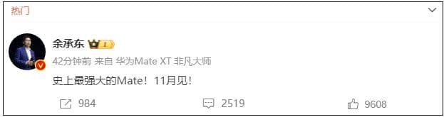 11月4日,华为常务董事、终端BG董事长余承东在个人微博上表示:“史上最强大的Mate!11月见!”
