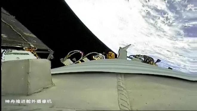 11月4日,神舟十八号载人飞船返回舱与推进舱分离,叶光富、李聪、李广苏3名航天员正式踏上回家之路。 图片来源:CCTV+