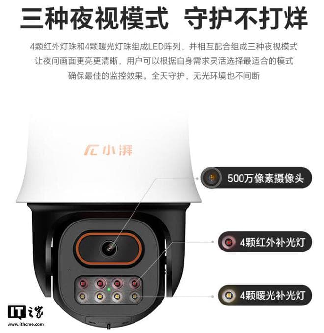据介绍,荣耀亲选小湃室外摄像头 i 拥有 500 万像素镜头、具备 2880*1620 分辨率。该款摄像头拥有 4 颗红外灯珠和 4 颗暖光灯珠组成的 LED 阵列,相互配合可组成智能夜视、红外夜视、全彩夜视三种夜视模式。