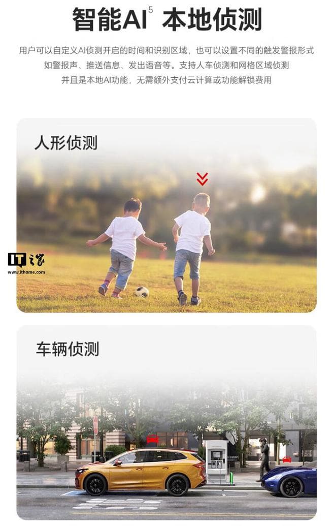 小湃室外摄像头 i 具备智能 AI 本地侦测功能,支持用户自定义 AI 侦测开启时间和识别区域,提供人形侦测、车辆侦测和网格区域侦测,同时支持智能跟踪,可自动识别并放大目标,云台也可跟随目标移动。