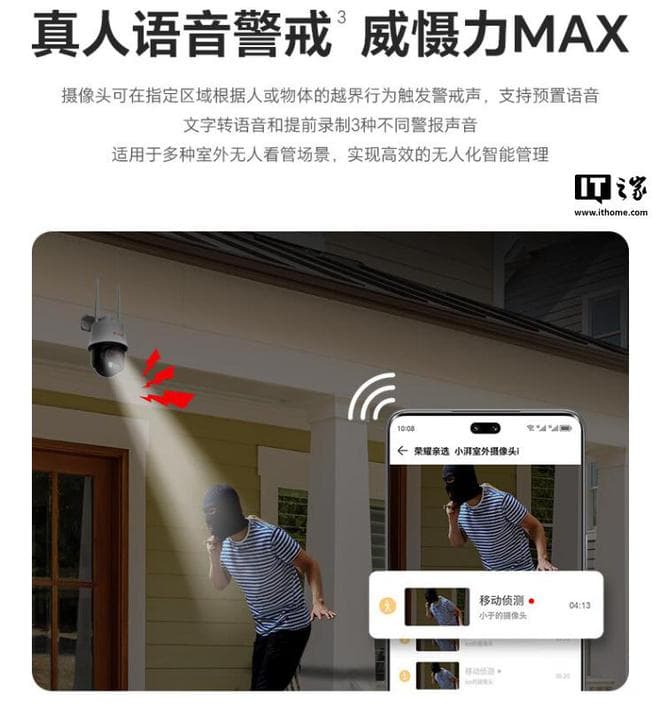 荣耀亲选小湃室外摄像头 i 提供双向语音通话 + 真人语音警戒功能,支持吊装、壁装、抱杆三种安装方式;摄像头还支持无线 + 有线网络连接,拥有 MicroSD 卡和云存储两种存储方式。