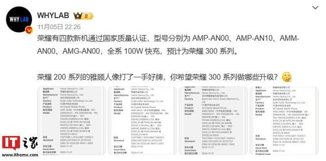 结合博主 @WHYLAB 消息和网友讨论,此次通过认证的新机有望全系支持 100W 快充,预计为荣耀 300 系列。