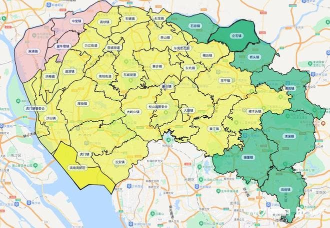 第三批开放区域包括望牛墩、麻涌、中堂三镇,总面积约为181平方公里行政区域,即图中粉色区域。图源东莞市工业和信息化局