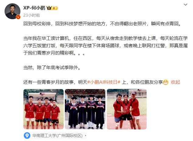 他表示,回到母校华南理工大学进行彩排,重返科技梦想的发源地,不禁翻出了这些老照片,瞬间唤起了青春的记忆。何小鹏回忆道,当年他在华工攻读计算机专业,住在西区宿舍,每天步行至教学楼上课,轮流在学六和学五饭堂用餐,和同学们在楼下体育场踢球,或晚上联网玩《红色警戒》,那是属于他们青葱岁月的精彩,当然,除了年底的考试季。