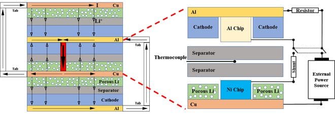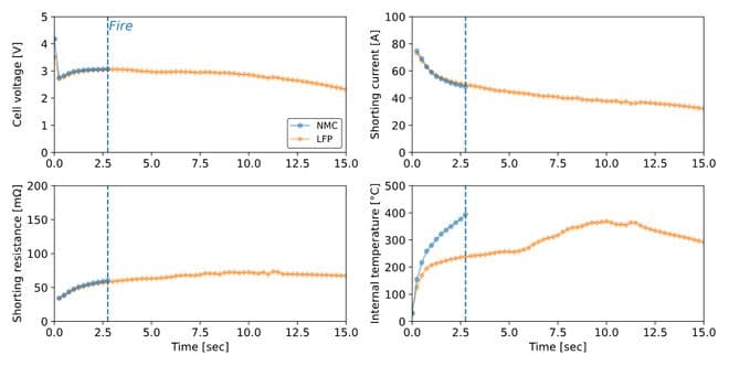 图1. 锂金属电池的单层内部短路。 a, 物理问题和相应实验设置的图示。 b, 使用 NMC 811正极的AFB电池的重复性测试,其中阴影区域表示 ±1 σ的误差。在内部短路开始后2.6秒左右 (用垂直虚线标记),所有4个电池都起火。 c, ISC 后 t=3.6秒 b 中4个电芯的照片。 d, 使用 LFP 正极的AFB电池的重复性测试,其中阴影区域表示 ±1 σ的误差。所有3个电芯都没有起火。