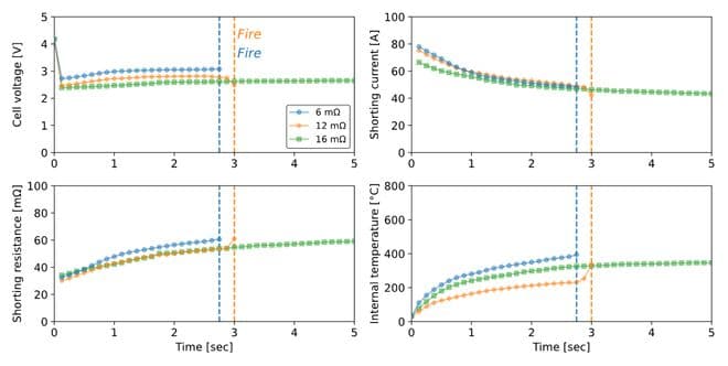 触发电池燃烧的另一个关键因素是热输入,它与短路电流的平方成正比。我们通过在测量回路中添加额外的电阻来系统地改变短路电流,如图1a(右)所示。图3a 显示了 AFB 的三个实验,分别使用额外的6、12和16 mΩ 电阻。可以看出,初始短路电流相应地从81 A 下降到67 A。初始短路电流为81 A 和78 A 的6 mΩ 和12 mΩ 外壳在短路时分别在2.4秒和3.0秒起火。但是,当初始短路电流降至67 A(在16 mΩ 的情况下)时,不会起火。这表明存在一个短路电流阈值,约为 ~70A,以触发电池起火。转换为 C 倍率,该阈值相当于2.6Ah 电池的 ~27C。触发火灾的阈值短路电流的存在表明,如果短路电阻足够大,比如软短路的情况,可能不起火,也不会冒烟。因此,在电池内短路的定量科学研究中必须精确控制短路电阻。否则内短路后果表现随机;先前未能报告和精确控制这一关键实验参数的实验结果也是随机的。另外,这里发现的起火阈值短路电流的技术意义是,全固态电池可以通过设计和制造具有较大内阻来避免起火,例如采用复合集流体。