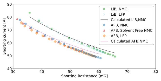 图3. 短路电流的影响。 a、 单层 ISC 后的电池电压、短路电流、短路电阻和内部温度。 b, 短路电流主要由各种 AFB 电池和 LiB 电池中的短路电阻分别控制。
