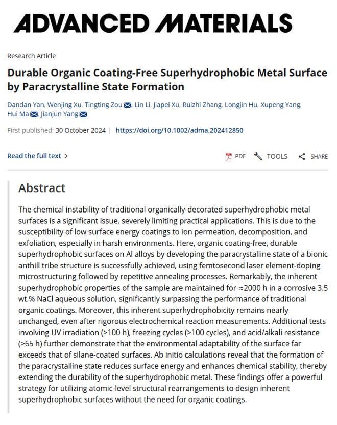 另外,研究发现这种自主性的超疏水金属表面也能承受住不同酸碱溶液浸泡、紫外辐射和冷冻循环等多种苛刻环境的挑战。与此同时,该团队与沈阳金属研究所的马会老师团队携手合作,运用从头计算方法,从理论层面进一步验证了次晶相态形成对于材料表面能降低和化学稳定性提升所起的重要贡献。