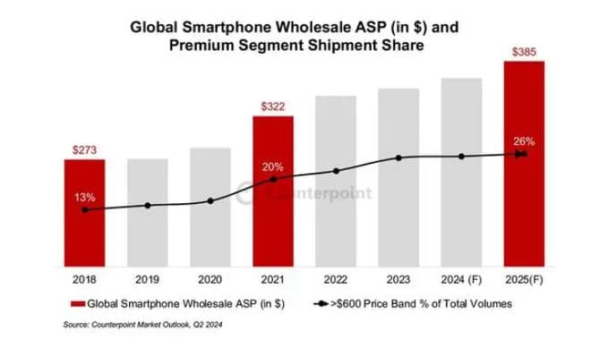 据Counterpoint Research发布称,2024 年全球智能手机平均售价(ASP)达到 365 美元(约 2620 元人民币),同比增长 3%。