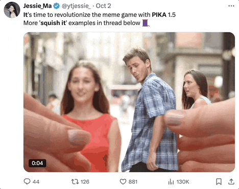 同样是让用户有强烈的个人参与感,10月2日Pika 1.5更新后,全网迅速刮起了一股捏捏解压风。