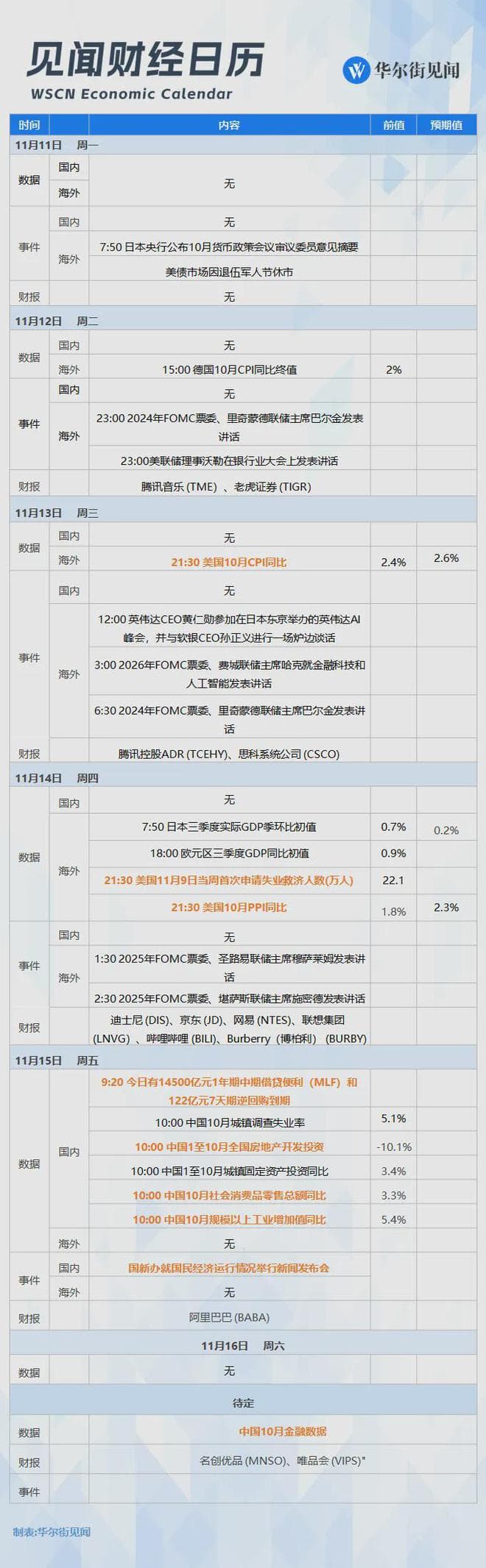 重点关注:中国10月金融及经济数据,美国10月CPI、PPI,鲍威尔发表讲话,欧央行公布10月货币政策会议纪要。网易、京东集团、腾讯控股、哔哩哔哩、阿里巴巴等公司将披露财报。