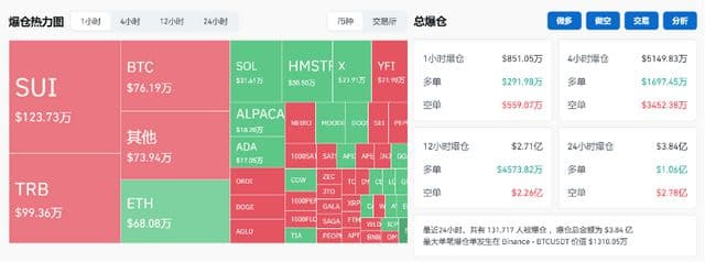 加密货币近期的持续大涨让部分参与做空的投资者损失惨重。根据Coinglass行情数据,最近24小时,共有131771人被爆仓,爆仓总金额为3.84亿美元。最大单笔爆仓单发生在Binance-BTCUSDT,价值1310.05万美元。