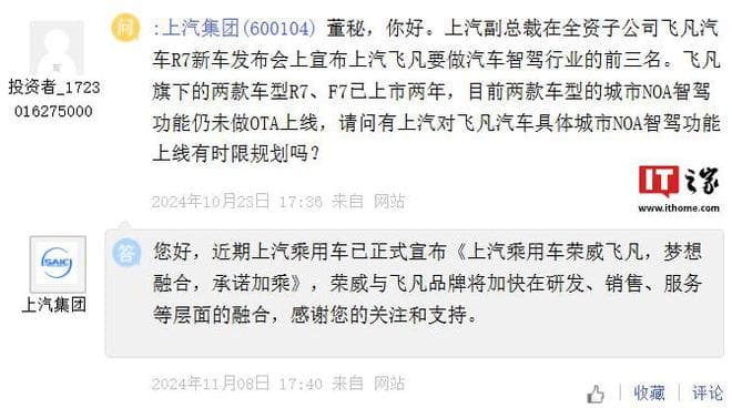 IT之家 11 月 11 日消息,上汽集团于今年 11 月 8 日在上证 e 互动回复投资者提问时表示,近期上汽乘用车已正式宣布《上汽乘用车荣威飞凡,梦想融合,承诺加乘》,荣威与飞凡品牌将加快在研发、销售、服务等层面的融合。