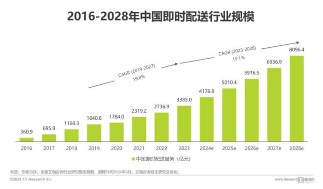 越来越多的个人和企业客户对具有时效性的快递服务提出了更高要求,一对一急送行业已成为中国发展最快的行业之一。根据艾瑞咨询在今年4月份的预测,中国即时配送行业总市场规模已从2019年的1641亿元,以19.8%的复合年增长率增至2023年的3385亿元,并预计行业将以19.1%的复合年增长率,整体规模在2028年增长至8096.4亿元,这其中,作为细分市场的即时专送增速更高,预计2023年-2028年的增速可达到27.8%。