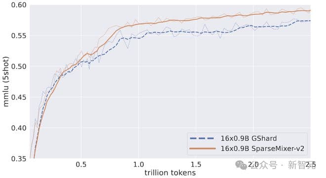 在前0.5T token上GShard表现更好,但SparseMixer-v2在训练后期取得了更强的性能。