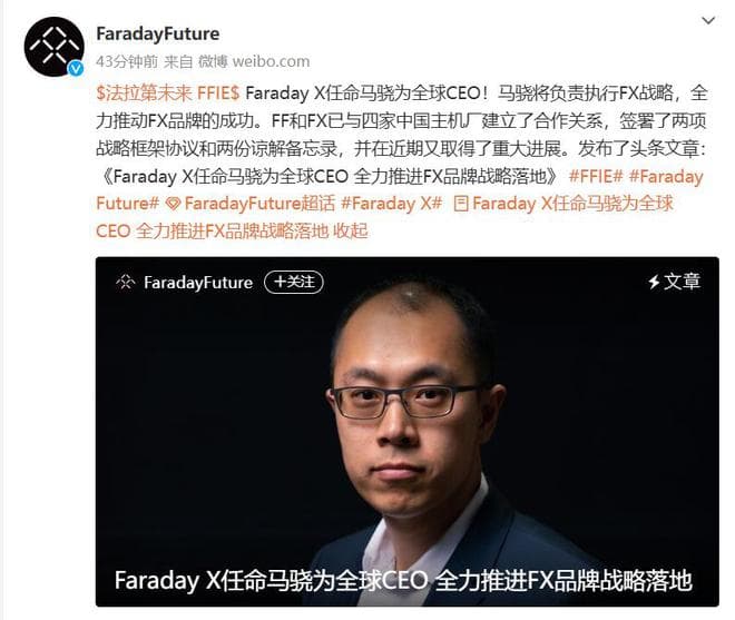 Faraday X任命马骁为全球CEO,向贾跃亭汇报