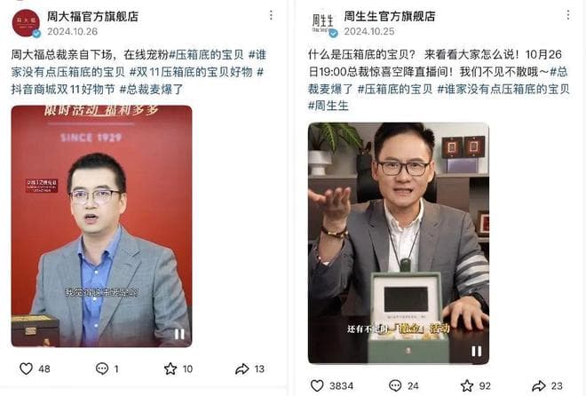 一些自带热度的总裁会使用个人账号,最典型的是雷军在11月1日的返场直播中分享征战纽北的幕后故事;现身自家品牌的直播间也比较常见,如周大福、周生生、老庙三家头部珠宝品牌的高管,都于10月底在官方旗舰店账号开播。