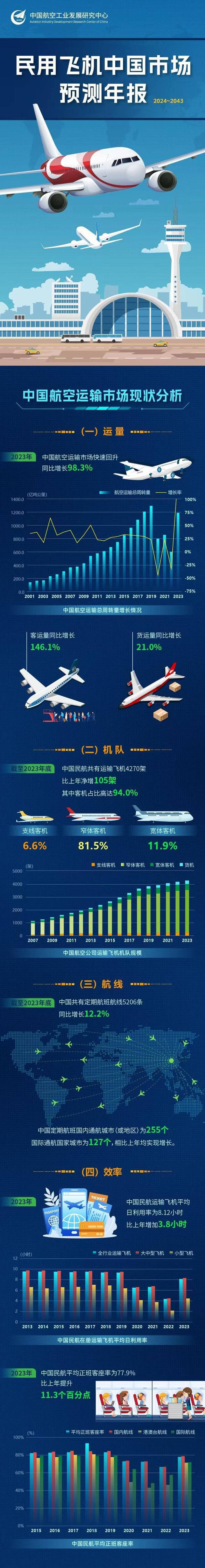 2024年11月12日,中国航空工业集团有限公司在珠海航展现场举行《2024-2043年民用飞机中国市场预测年报》新闻发布会,发布了对未来20年民用飞机中国市场的最新预测。