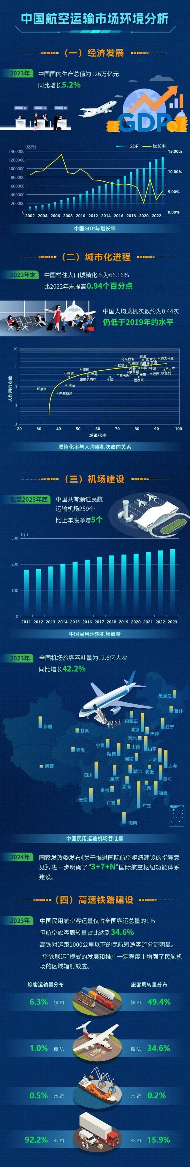 2023年,中国国内生产总值为126万亿元,同比增长5.2%,中国经济对全球经济增长的贡献率达到32%,仍然是稳定世界经济增长的重要力量和最大引擎。按照党的二十大部署,2035年中国要达到中等发达国家水平。未来,中国经济仍将长期保持稳定增长,商贸和旅游业的发展将推动中国航空运输市场持续增长,为了满足航空运输市场需求,中国航空运输机队规模将继续保持增长。