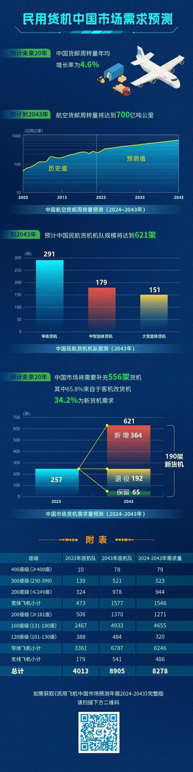 航空工业集团发布民用飞机中国市场预测 :2024到2043年需补充各型民用客机8
