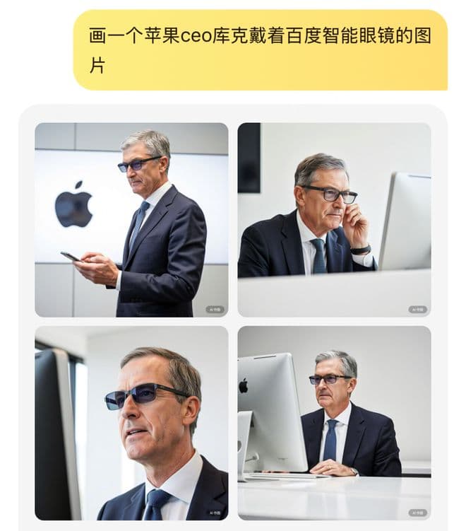 昨天,百度发布了智能眼镜,记者请文心一言画一个苹果CEO库克戴着百度眼镜的图片,图片呈现了苹果的LOGO,但显然人物并不是库克本人,只是长相相似,图片中所戴眼镜的形状也并不完全相同。