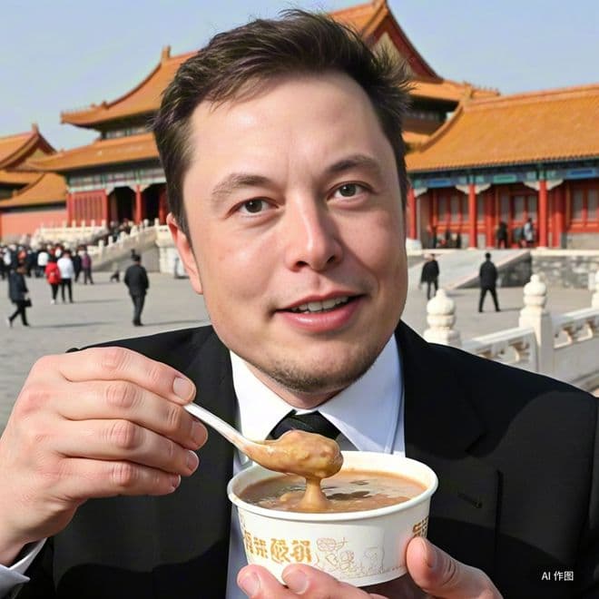 我们让AI画了一张马斯克在故宫喝豆汁的图片,AI画的人物很像马斯克本人,故宫场景也较为逼真,但放大图来看,马斯克喝的并不是豆汁,碗上的文字也是乱码。