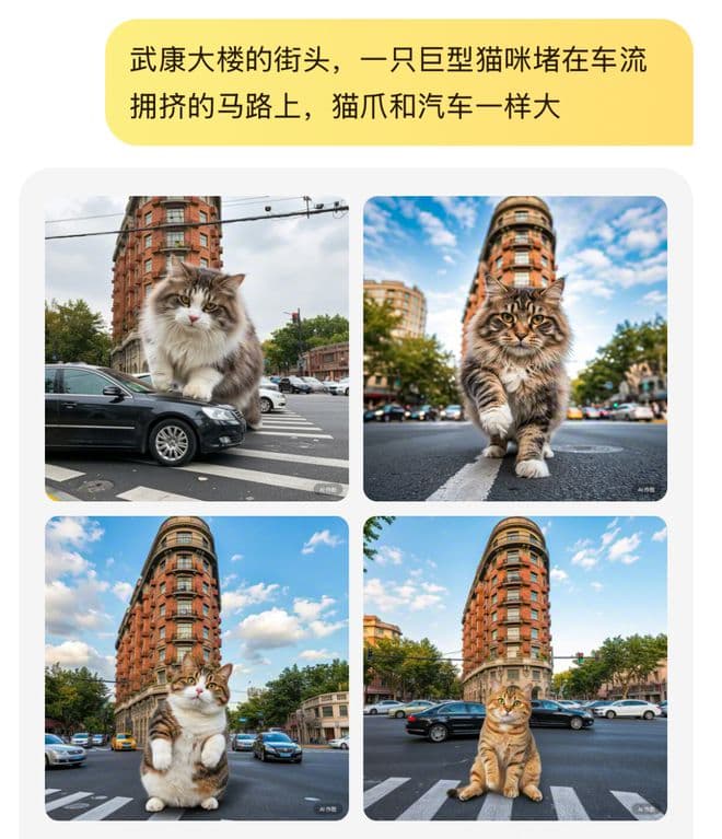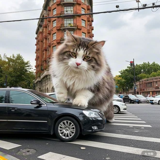 但是当给出AI更加真实和细节的场景,绘画的效果好了不少。例如“武康大楼的街头,一只巨型猫咪堵在车流拥挤的马路上,猫爪和汽车一样大”,这样超现实主义的作品完成度很高,对于武康大楼等细节还原也不错。