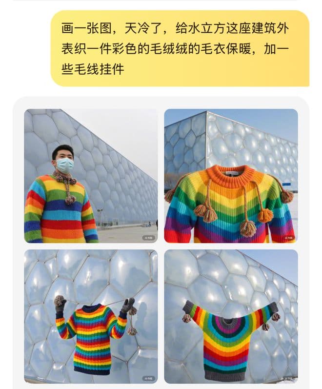 但相似的提示词换成建筑“水立方”,效果却大打折扣,变成了一位穿着彩色毛衣的男士在水立方前方站立,AI还给水立方织了一件“并不合身”的人类毛衣。