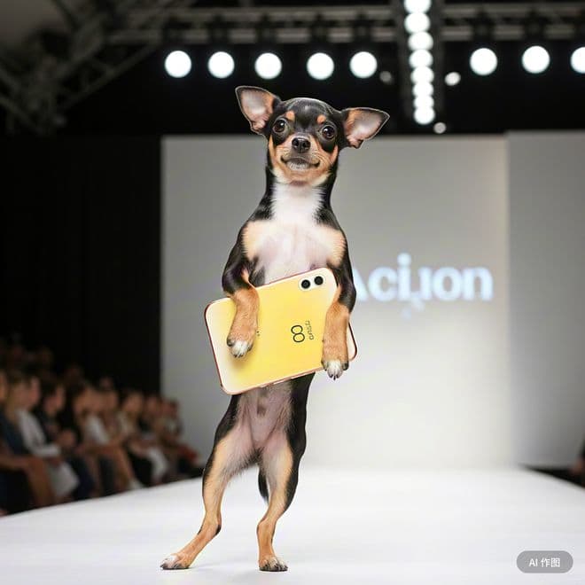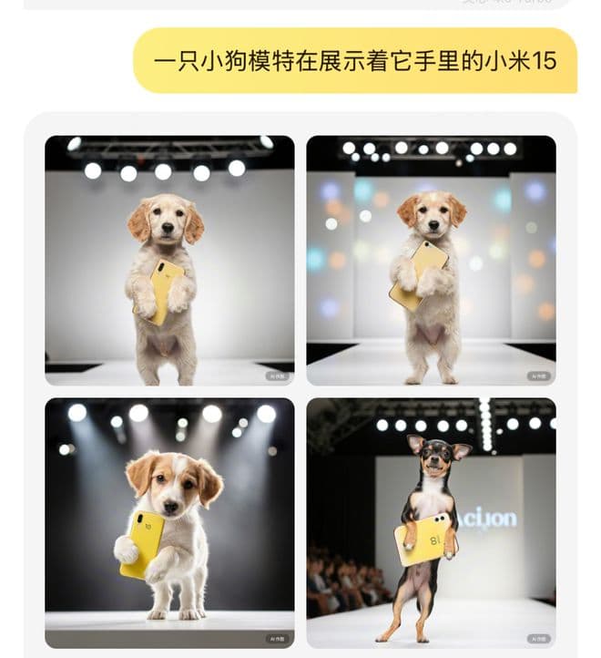 接下来我们让AI画一个对于小米15手机的展示,场景和动物形象表达准确,但每一张图中的手机都不一样,也并不像小米15,其中一张图的手机大得更像平板电脑。