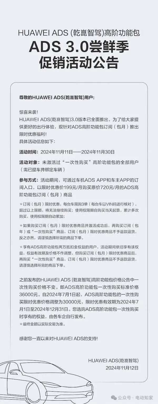 电动知家消息,11月12日深夜,华为智能汽车解决方案宣布,HUAWEI ADS(乾崑智驾)3.0版本已全面推出,与此同时,该高阶智驾包推出限时优惠活动。此次活动从今年11月11日开始,持续至11月30日,面向所有未激活过“一次性购买”高阶功能包的用户,华为高阶智驾包订阅服务从原价720元/月爆降至199元/月。之前发布的HUAWEI ADS(乾崑智驾)高阶功能包的一次性购买价格不变,仍为3万元。