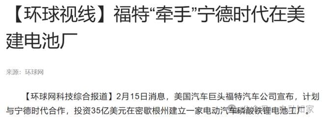 事实上,早在2023年2月,美国汽车巨头福特汽车公司宣布,计划与宁德时代合作,投资35亿美元在密歇根州建立一家电动汽车磷酸铁锂电池工厂。据悉,该工厂计划在2026年投产,年产能约为35千兆瓦时,每年约可为40万辆电动汽车提供动力电池,将创造约2500个就业岗位。福特汽车方面表示,作为计划的一部分,福特与宁德时代已经达成一项新的协议。根据协议,宁德时代将为福特磷酸铁锂电池工厂的生产提供技术与服务支持,福特工程师则将会负责电芯与整车集成工作。福特汽车CEO吉姆·法利表示:“新工厂生产的电池将降低电动汽车成本从而降低电动汽车的定价,汽车制造商的利润也因此更高。”