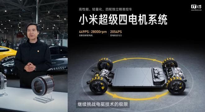小米超级四电机系统迎来升级,包括 2 个全新自研电机 + 2 个 V8s 电机,最大马力可达2054PS。全新自研前电机最高转速可达 28000 rpm,单电机最大马力 449PS,单电机峰值扭矩 380N・m。