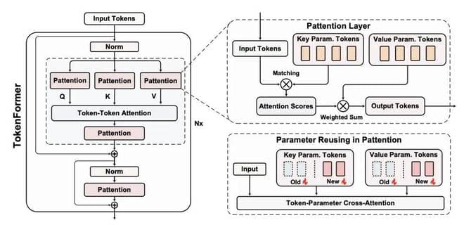 Tokenformer 的核心创新是 Token-Parameter Attention(Pattention) Layer,它结合了一组 Trainable Tokens 作为 model parameters,并通过 cross-attention 来管理 Input Token 与这些 Parameter Tokens 之间的交互。