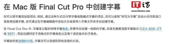 IT之家 11 月 15 日消息,科技媒体 9to5Mac 昨日(11 月 14 日)发布博文,报道称苹果公司最新更新了 Final Cut Pro 视频编辑工具,其中最值得关注的是引入了 AI 字幕生成功能,但遗憾的是现阶段仅支持英文。