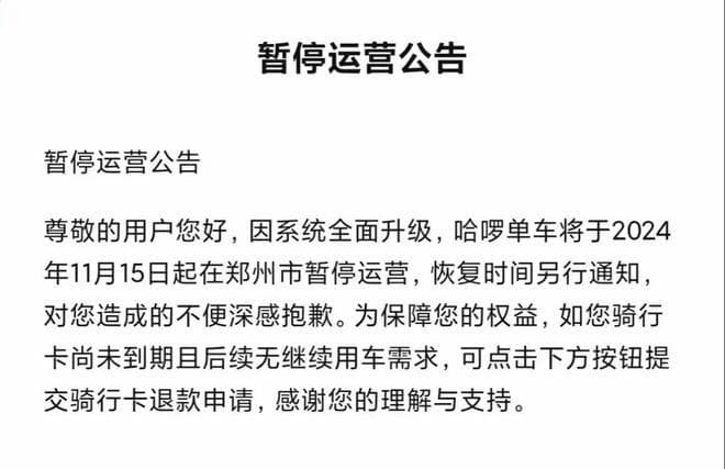 哈啰单车表示,因系统全面升级,哈啰单车将于2024年11月15日起在郑州市暂停运营,恢复时间另行通知。用户如有需求,可进行骑行卡退款。