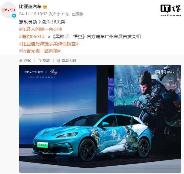 IT之家 11 月 16 日消息,2024 广州车展昨日开幕,比亚迪海豹 06 GT ×《黑神话:悟空》官方痛车首发亮相,官图现已公布。